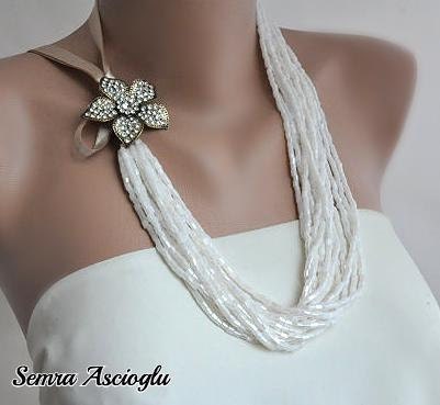 El Yapımı, Street Style, Çok Sıralı Bej Kolye ve Üzeri Zirkon Taşlı Broş Kolye